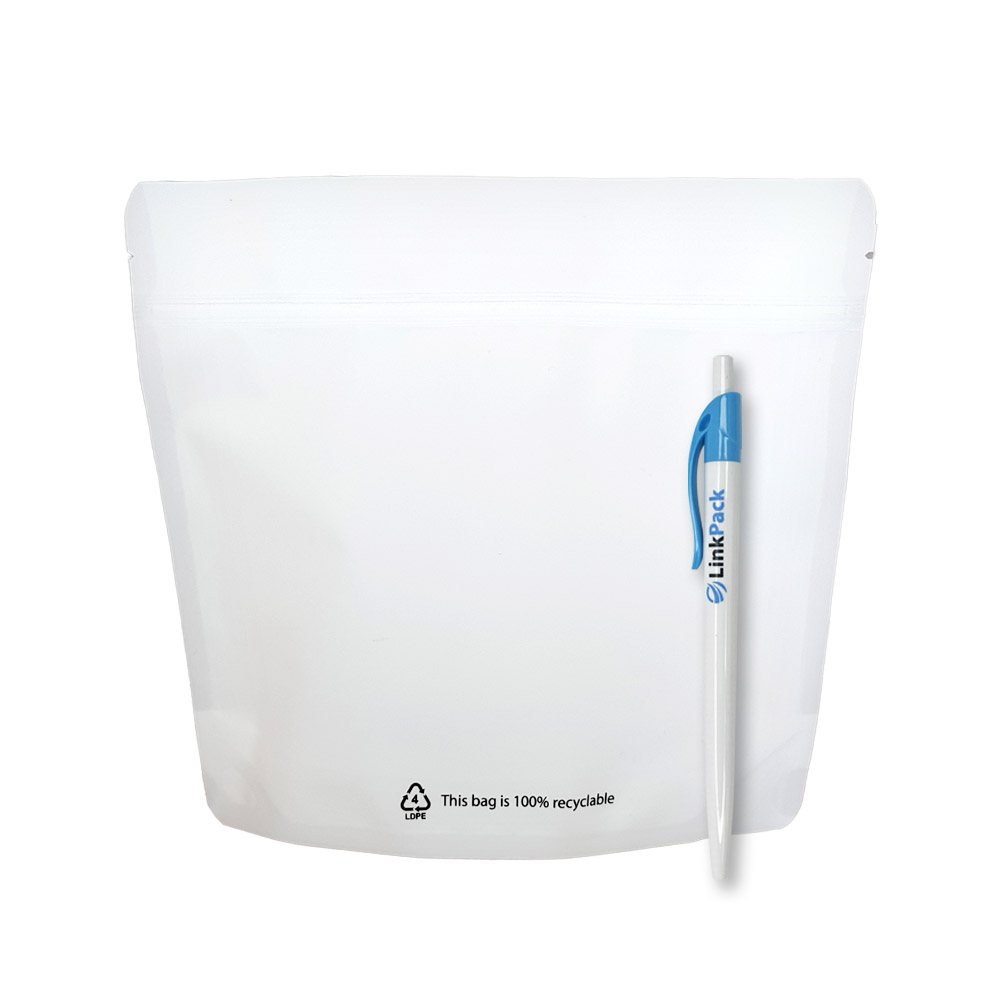 Этот дой-пак может быть повторно переработан, ведь в своем составе только полиэтилен низкой плотности LDPE 4.