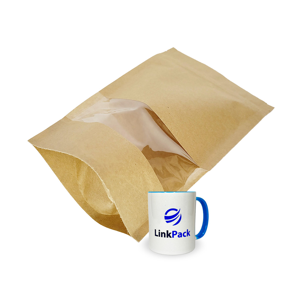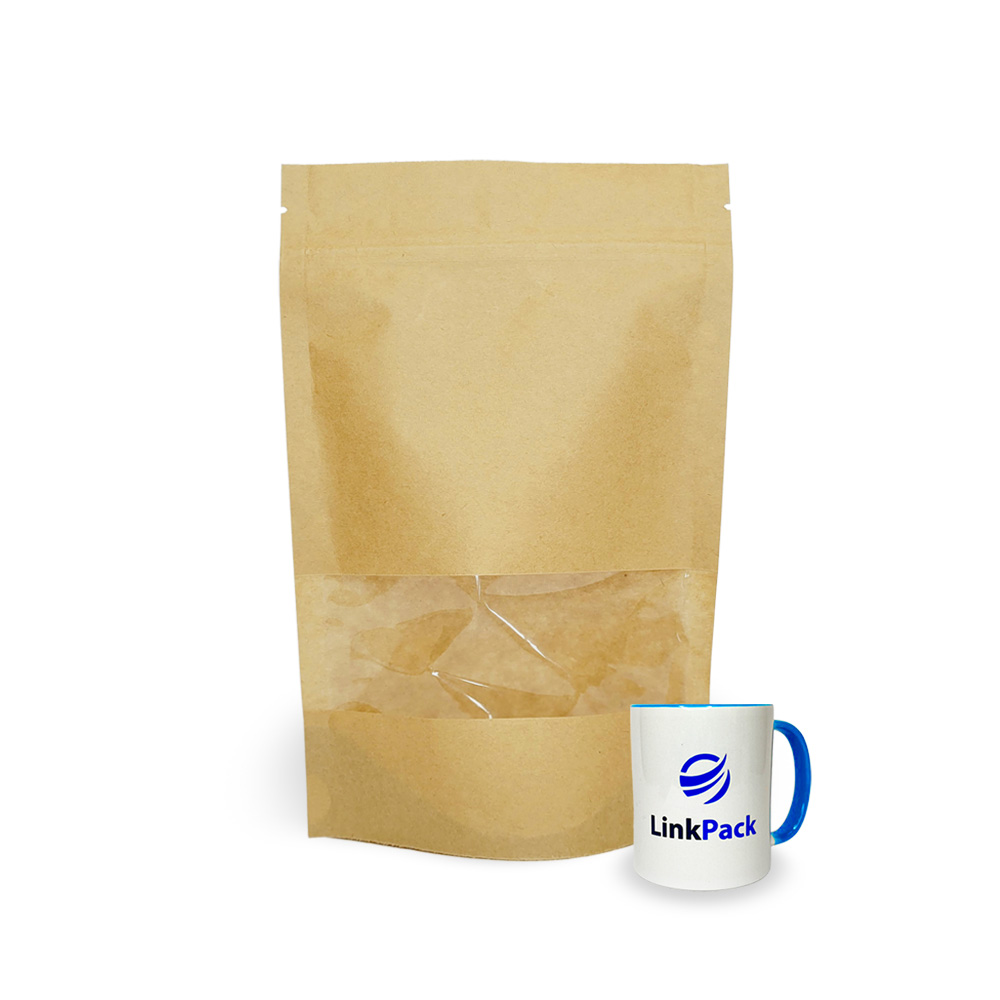 Дой-пак крафт с окном — универсальный тип упаковки, который может использоваться для сыпучих весовых и штучных товаров. Благодаря раскрывающемуся при наполнении дну дой-пак с окном устойчив в вертикальном положении, что позволяет его использовать для витринной выкладки и транспортировки в коробке.