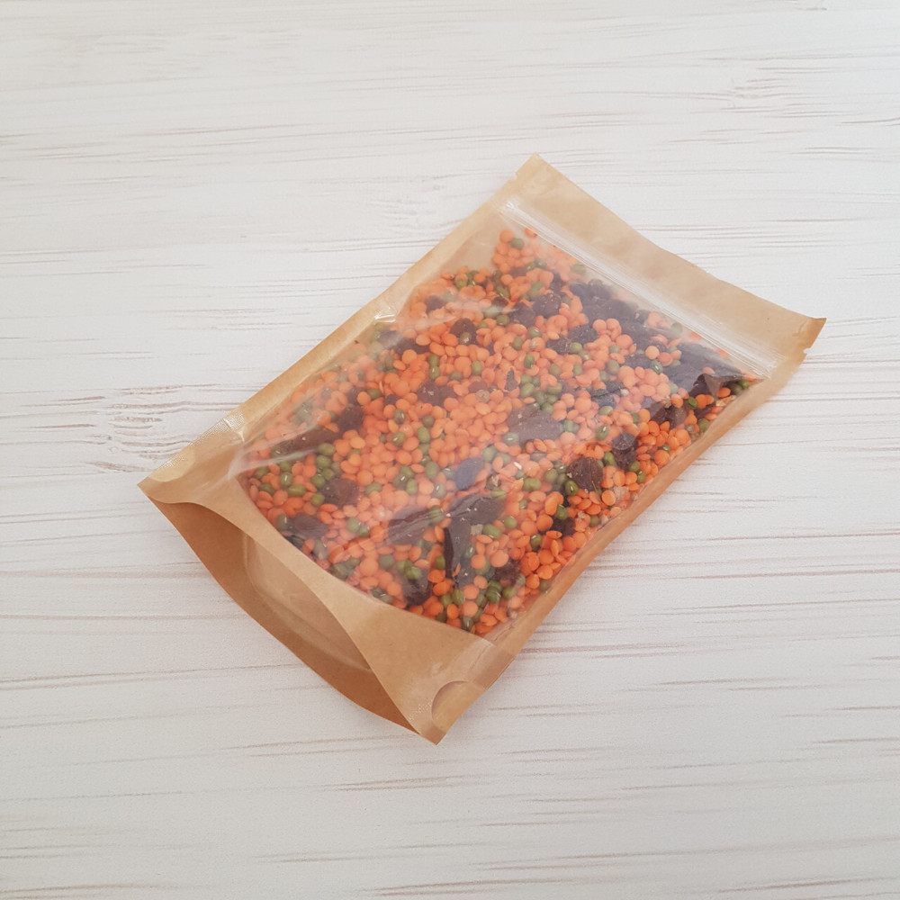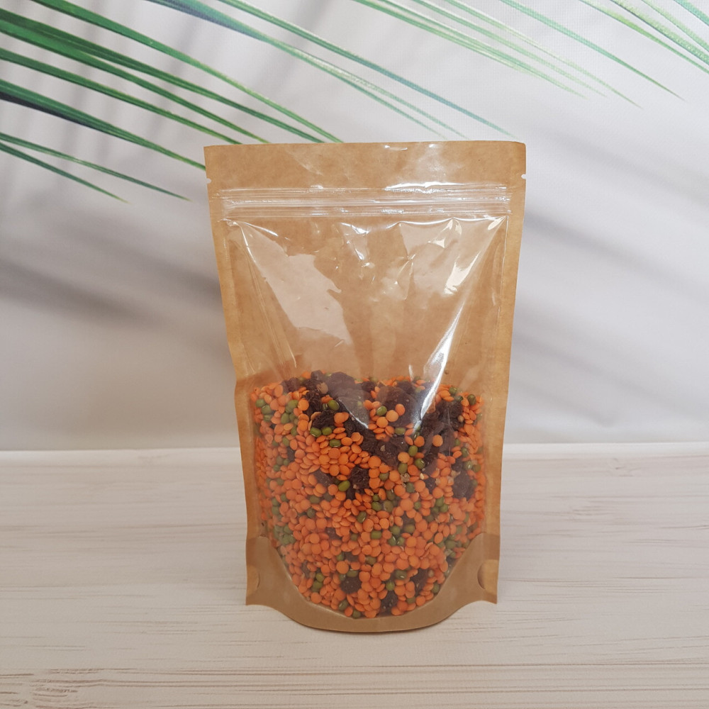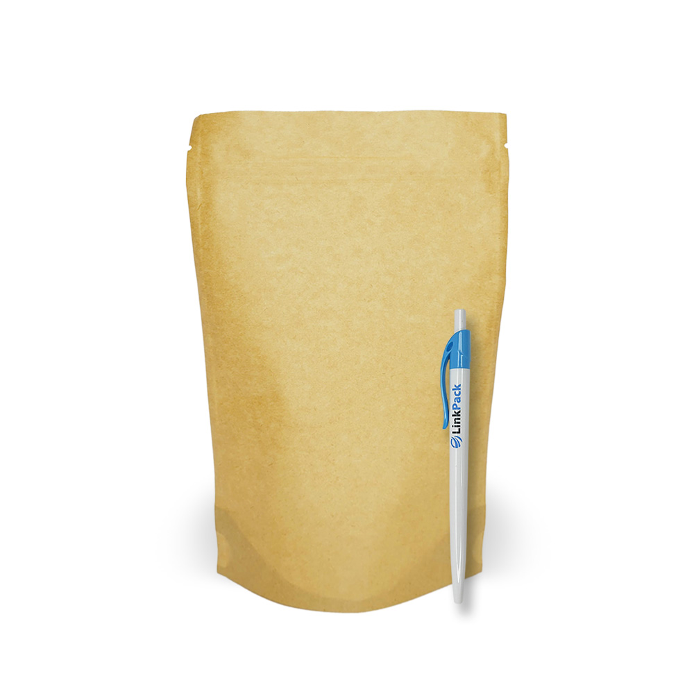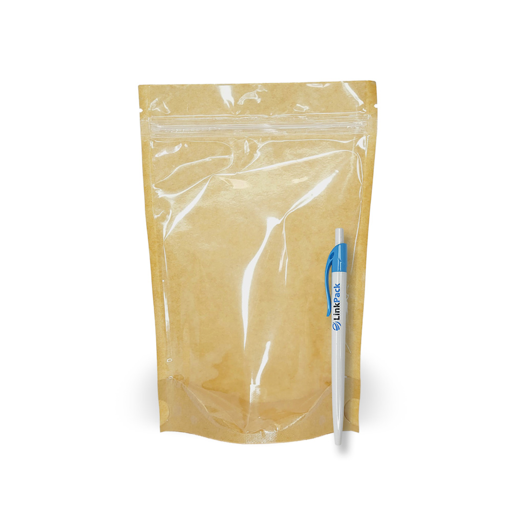 Дой-пак выполнен из бурого крафта с добавлением полиэтилена во внутреннюю часть. Это позволяет как изолировать продукт от внешней среды, так и делает возможным создание прозрачной стенки, эта стенка: